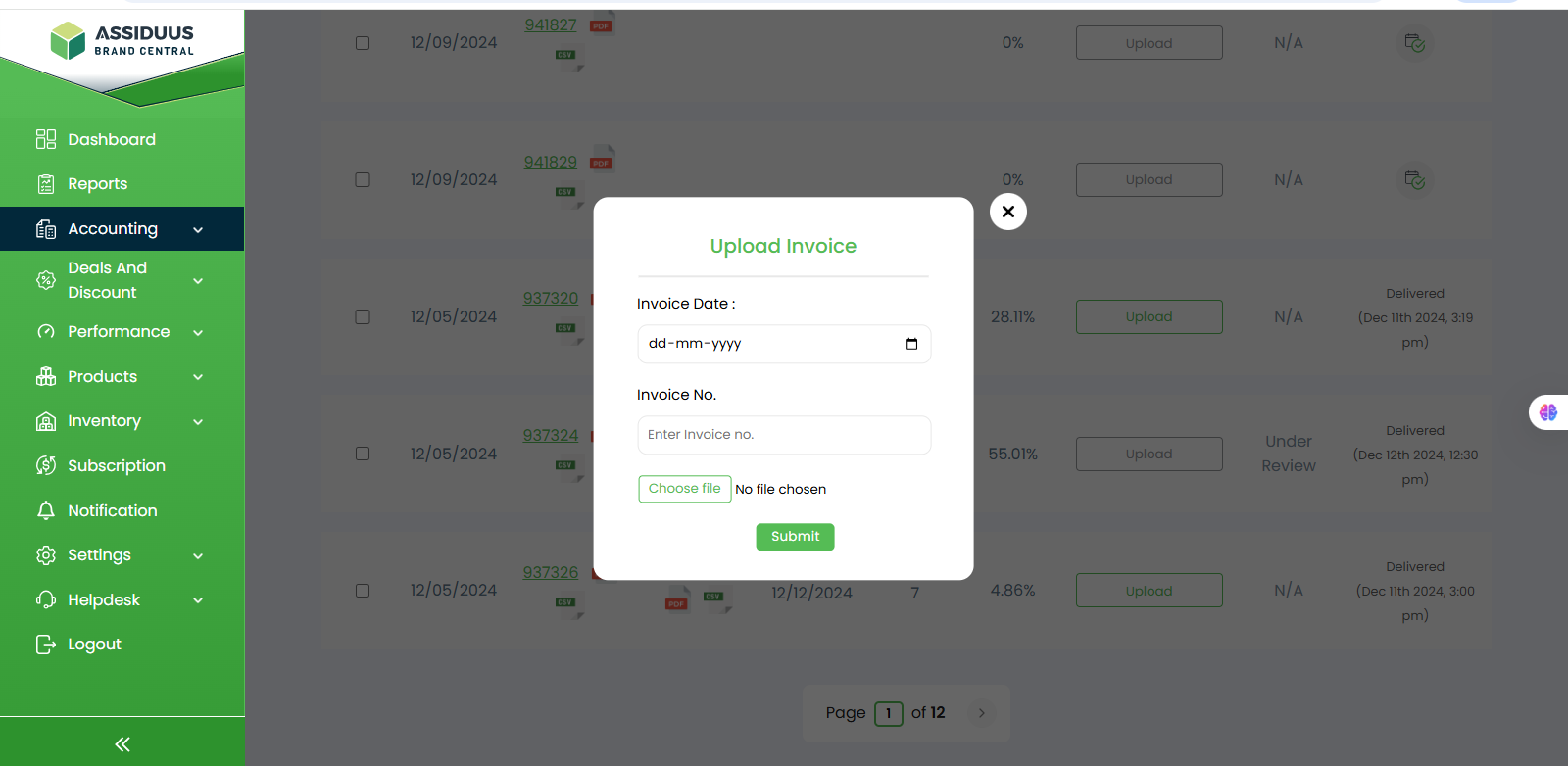 7.Upload Invoices: When you click the Upload button under the Invoice column, a pop-up titled Upload Invoice appears. In this window, you must select the Invoice Date from the calendar, enter the Invoice Number, and upload the invoice file in PDF or any supported format. After filling in the required details, clicking Submit completes the upload. This feature ensures accurate and timely submission of invoices, helping maintain proper financial records and ensuring smooth processing in the procurement cycle.