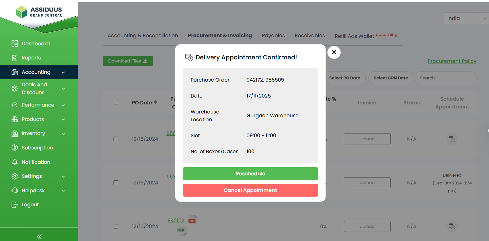 8.Schedule Appointment: When you click the scheduling icon under the Schedule Appointment column, a pop-up window opens displaying all relevant delivery details, including the Purchase Order numbers, Delivery Date, Warehouse Location, Selected Time Slot, and the Number of Boxes/Cases. From this pop-up, users can either Reschedule the delivery by choosing a new available time slot or Cancel Appointment if the delivery needs to be withdrawn. This functionality helps efficiently coordinate warehouse operations, manage delivery timings, and ensure a seamless inbound logistics process.