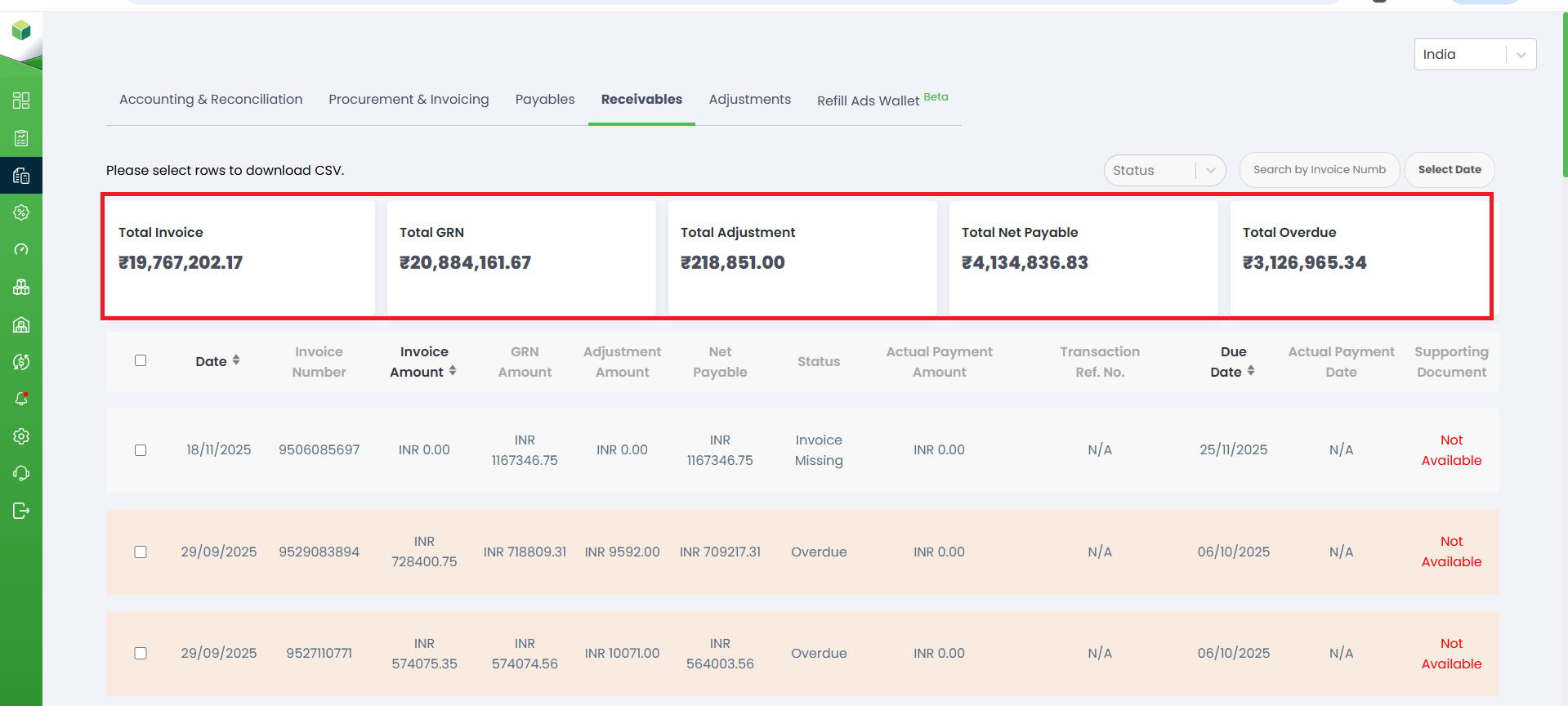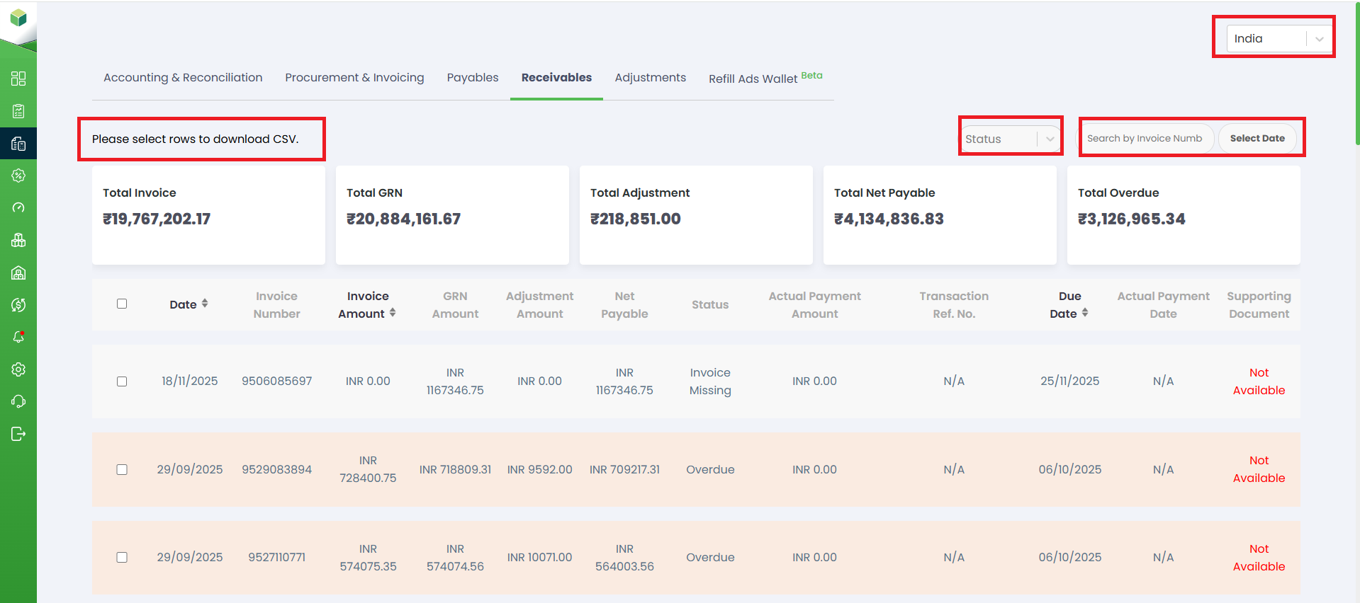 - Download CSV: On the page, you'll find a "Please select a rows to download file" label . This feature enables you to download a CSV file containing your receivable data. The CSV format provides a convenient way to export and store receivable information for further analysis and record-keeping purposes.