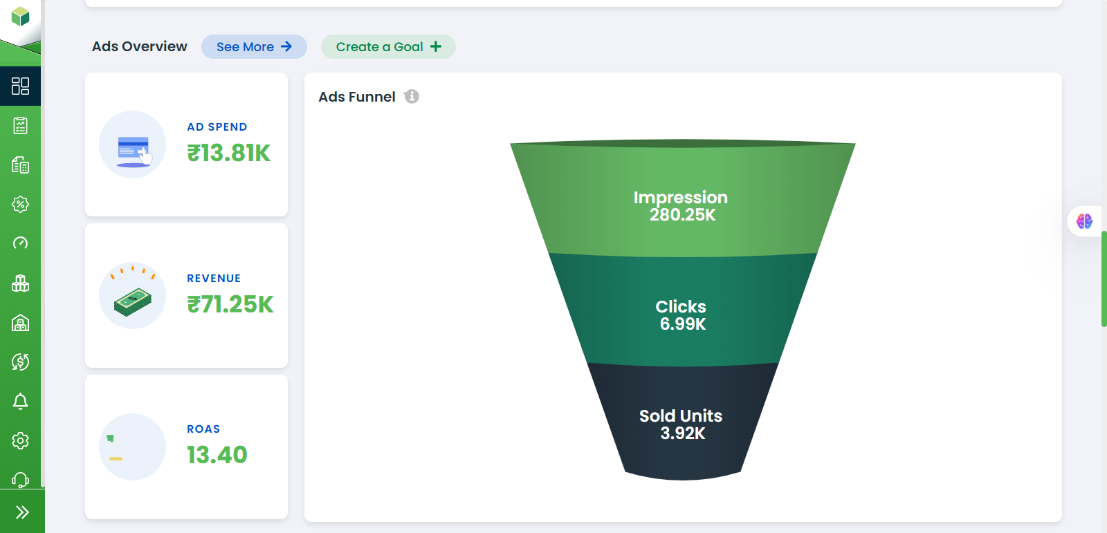 The ads overview section provides a summary of your ad performance, including your ad spend, revenue, and ROAS (return on ad spend). You can click the "See More" button to open the Reports section, where you can view more detailed ad reports. You can also click the "Create a Goal" button to create an ad performance goal for yourself.