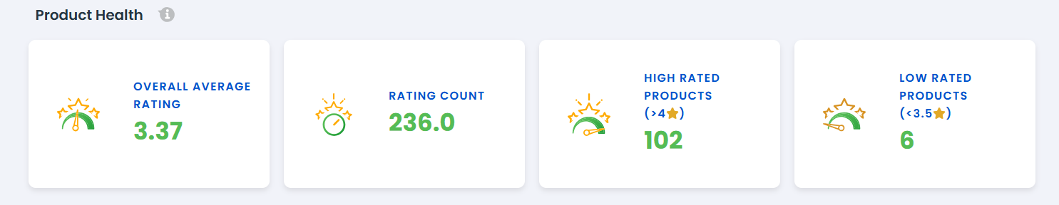 The product health section provides a summary of your product performance, including the overall average rating, rating count, high-rated products, and low-rated products. You can click the "i" icon to view more information about the date range, brands, and marketplace.