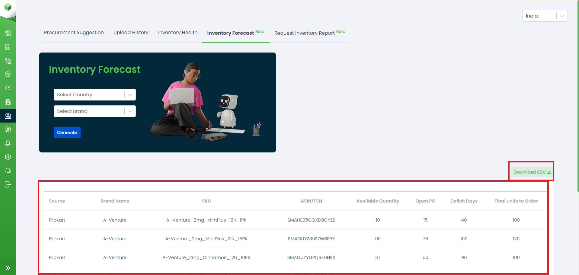 After generating the forecast, the system will display the Inventory Forecast report as shown below. These are the reports generated, and you can download the complete data by clicking the “Download CSV” button available at the top right of the table.