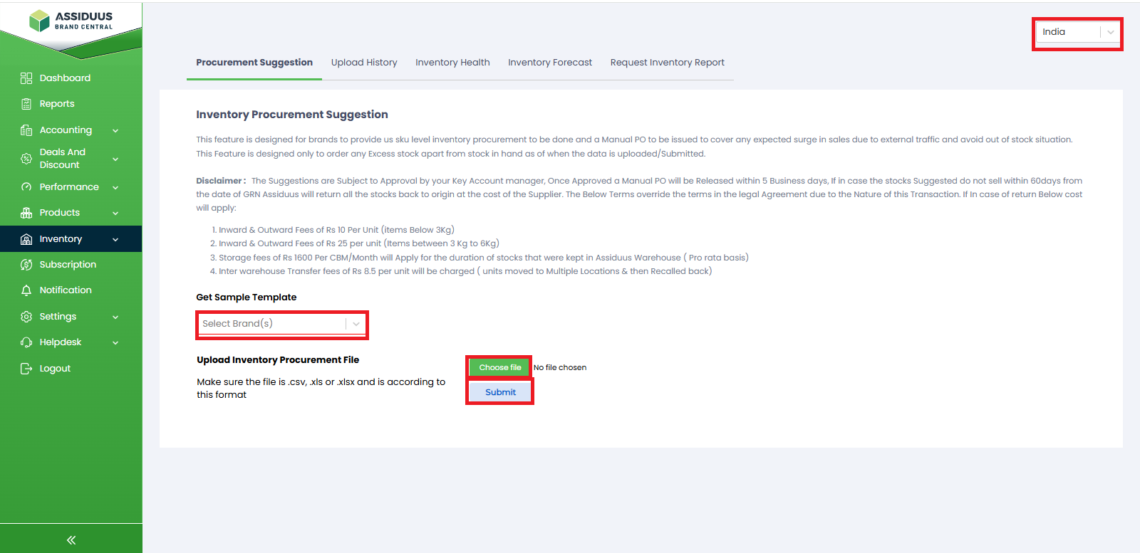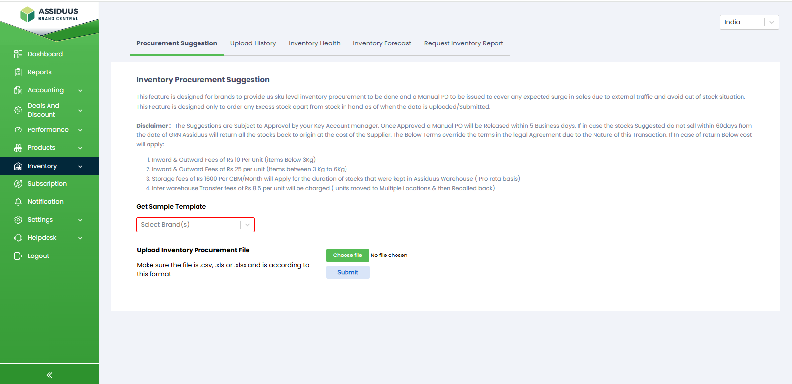 - Submission: Once you have completed the necessary steps and prepared your procurement data using the downloaded sample sheet, you are ready to submit. Click on the "Submit" button to proceed with the procurement suggestion process. The system will analyze your data and generate relevant suggestions based on your chosen country, brand, and file input.