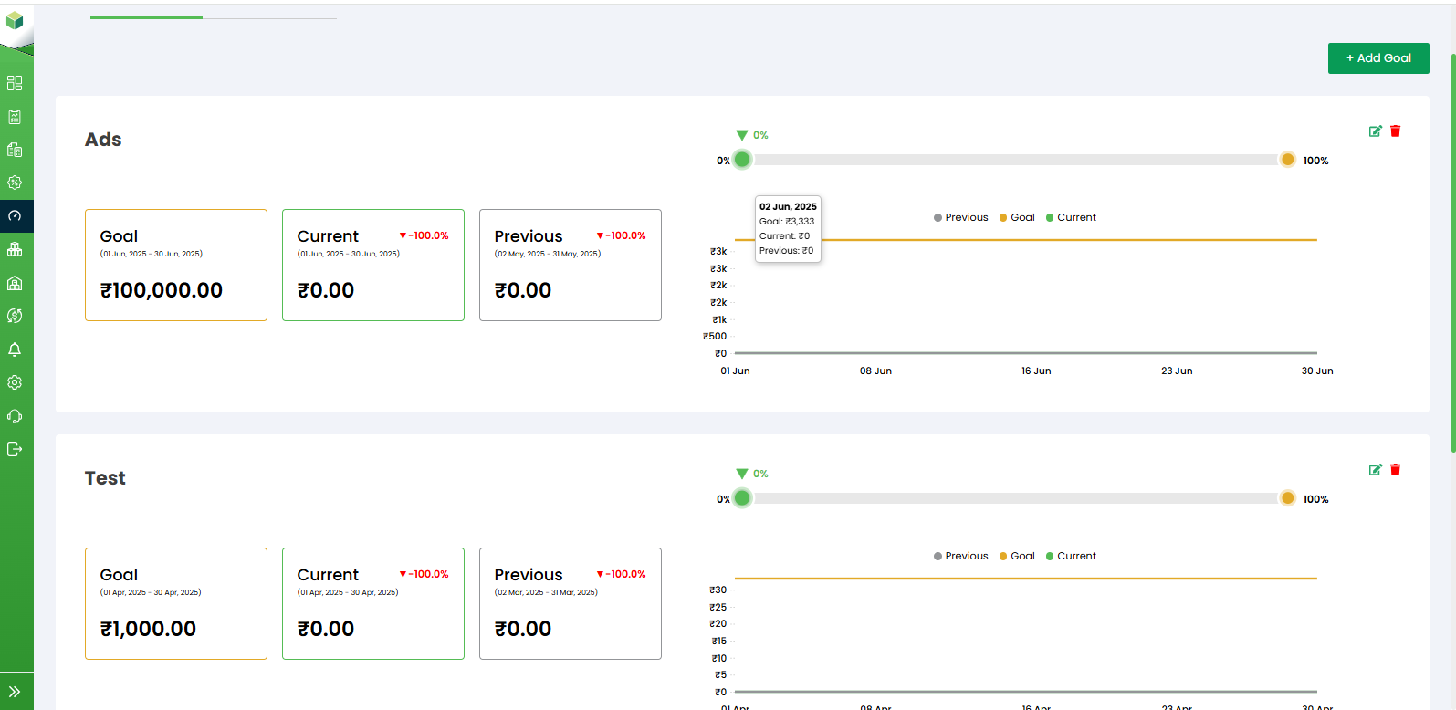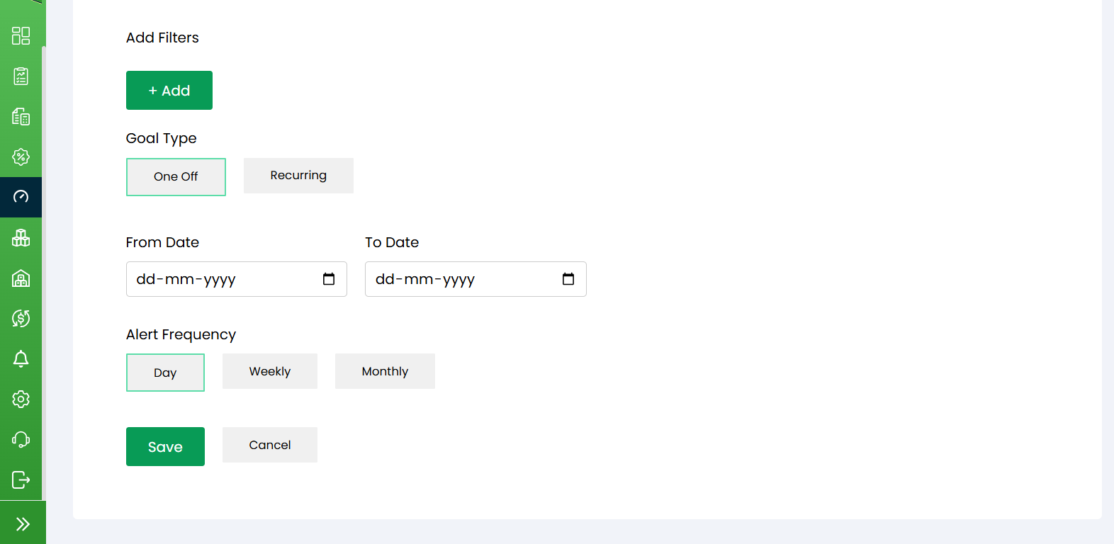 - Goal Type: Select the type of goal you want to create: a. One-Off: If you choose this option, you will be prompted to select a "From" date and a "To" date from the given calendar. Additionally, you can set the "Alert Frequency" to receive notifications on your progress. The available options for Alert Frequency are daily, weekly, or monthly. b. Recurring: If you select this option, the goal will be ongoing without a specific end date. you can set the "Alert Frequency" to receive notifications on your progress. The available options for Alert Frequency are daily, weekly, or monthly.