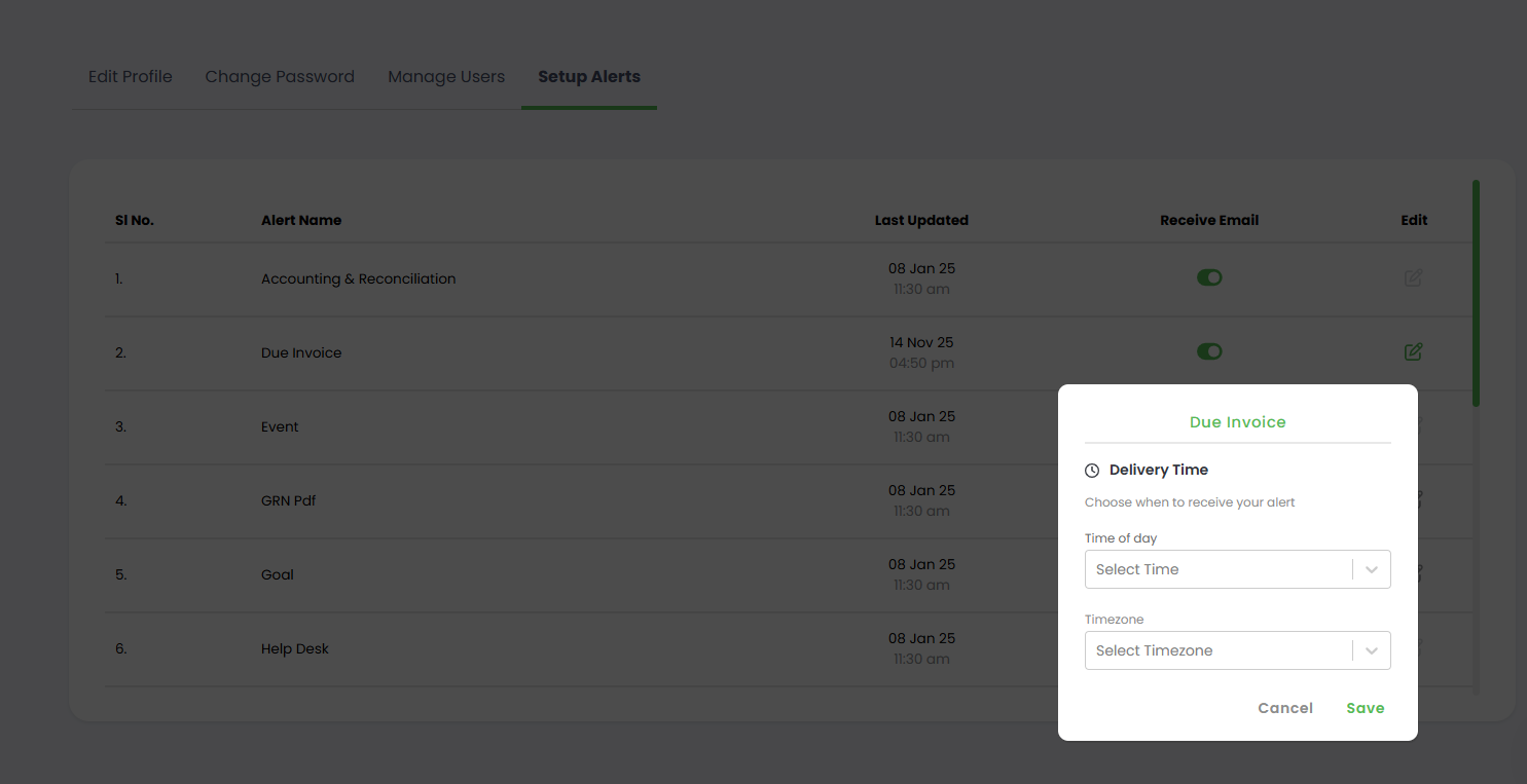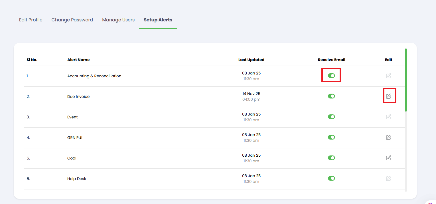 In the Setup Alerts section, you can manage your notification and email alert preferences. Here's how you can customise your alerts: