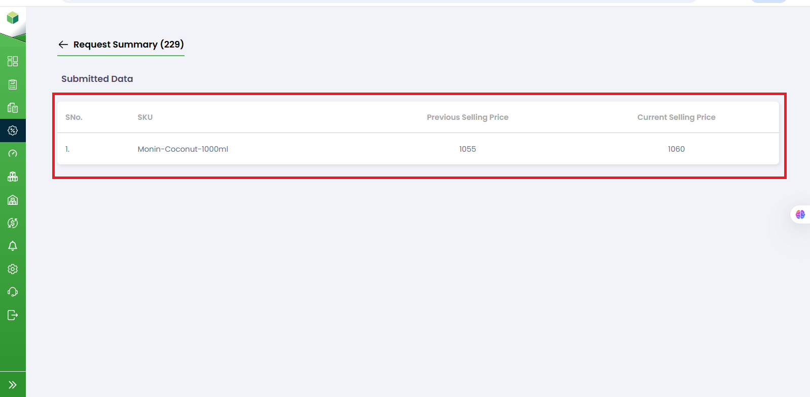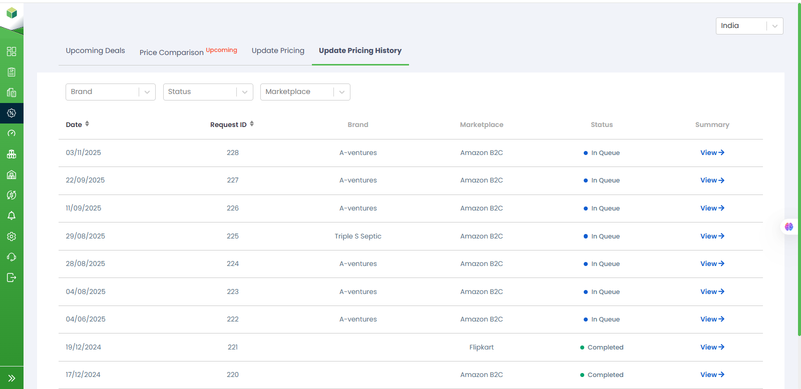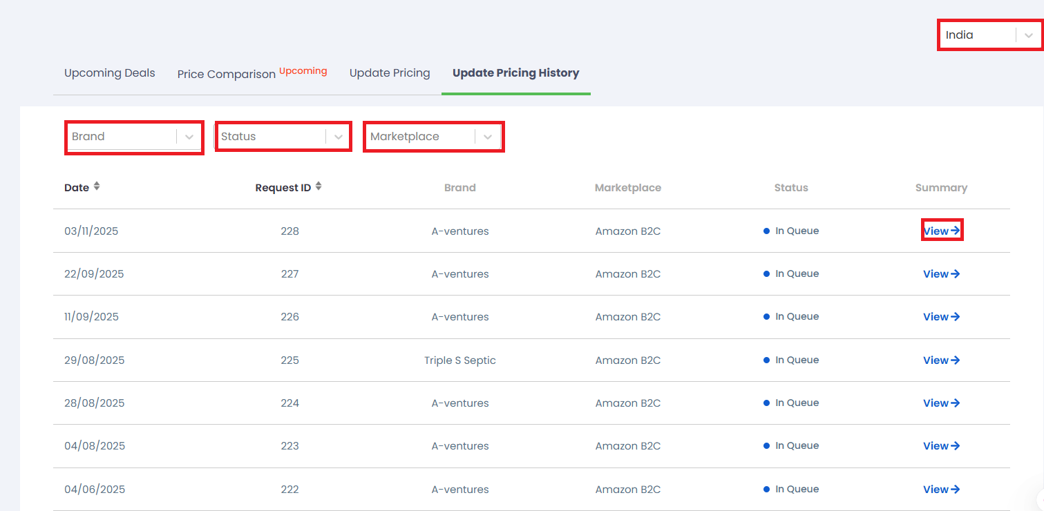 - Click the View option next to any request to see the detailed summary of that pricing update.